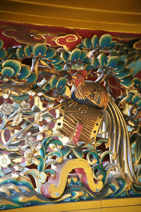 正式名称は「唐破風造り四脚門」と呼ばれ、国指定重要文化財になっています。両脇には、江戸時代初期の彫刻師左甚五郎作の昇り龍、降り龍が配されています。上部には、透彫(すかしぼり)の錦鶏鳥、銀鶏鳥が配され、門の内側には、中国の故事に由来する諫鼓鳥(かんこどり)に因んだ彫刻が施されています。
