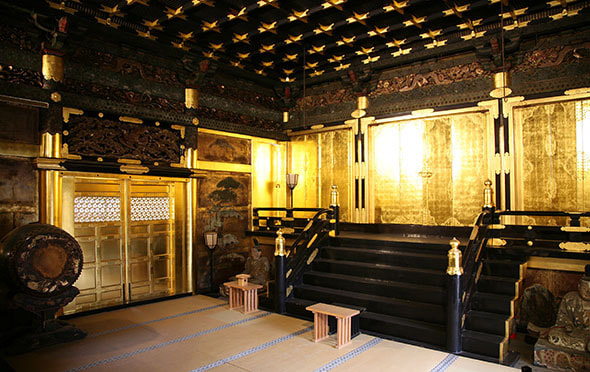 創建当時から、今日と同じく数十年に一度の修復が行われていたとのことですが、明確な記録の多くは残されていません。近年の修復は、平成21年(2009)から平成25年(2013)までの5ヶ年をかけて行われ、創建当時の金色が色鮮やかに蘇りました。