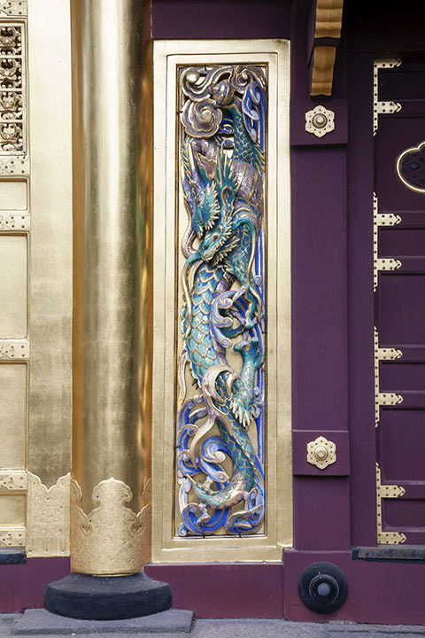 가라몬 옆에는 게이안 4년(1651)에 오와리, 기이, 미토의 도쿠가와고산케(도쿠가와 일가의 삼대 가문)가 봉납한 이른바 고산케 등롱이 있습니다. 가라몬 쪽부터 기이 가문의 도쿠가와 요리노부(이에야스의 10남), 미토 가문의 도쿠가와 요리후사(이에야스의 11남), 오와리 가문의 도쿠가와 미츠요시(이에야스의 9남인 요시나오의 아들)의 순서로 놓여 있습니다. 등 처마에 달린 구리로 된 용을 닮은 장식은 상상의 동물인 ‘신’(이무기)으로, 입에서 기운을 뱉어 신기루를 만든다고 전해집니다. 히부쿠로(불을 밝히는 곳)에는 선녀의 모습이 새겨져 있습니다.
