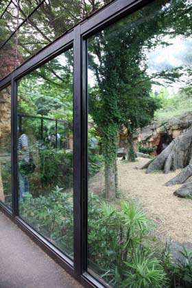 平成8年(1996)向游客全面开放的“大猩猩•老虎的森林”,撤去笼子和栅栏后改装上了玻璃。实现了将大猩猩和老虎的生活实况和生息环境一体化的观赏环境。