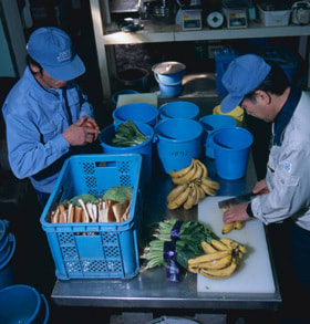 Feed for 400 species of animals is prepared in the feed preparation room. There is a variety of feed for animals in the zoo, including food products for human beings, vegetables, fruits, fish and shellfish, meat, eggs, cattle feed, pet food, natural products (moso bamboo, evergreen oak seeds and acorn), feed developed for animals, and living things produced for other purposes (rabbits, rats, mice and goldfishes).