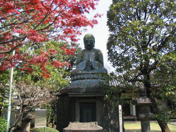 The inscription on the base of the figure tells that it was first set up to the right of the old main temple. This would now be about in the center of the present west side road to the north of the remains of the five-storied pagoda of Tenno-ji Temple. In 1874. the figure was moved to the western corner to open Yanaka cemetery. In June of 1933 it was repaired, moved to the present site and placed on a newly built ferroconcrete base. In 1938 the charnel house was built in the base.