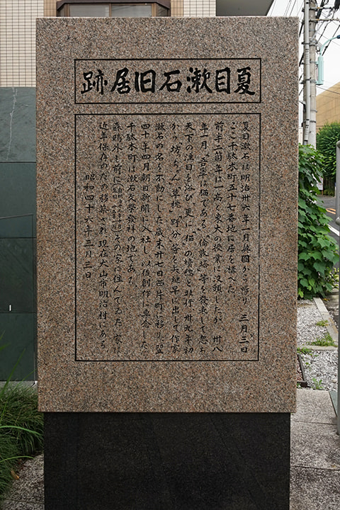 Ogai moved to a house called "Neko no Ie," or cat's house, which is famous for being also lived in by Soseki Natsume, after a divorce, and lived with his brothers in that house for a short period. Now, only a cat statue and a monument stand at the site. The building itself was relocated and reconstructed at Meiji Mura in Aichi Prefecture. (continued in the right column)