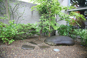 "San-nin Jogo no Ishi," a garden rock on which Ogai, Rohan and Ryokuu sat and had their picture taken, still remains in the garden of the memorial museum.