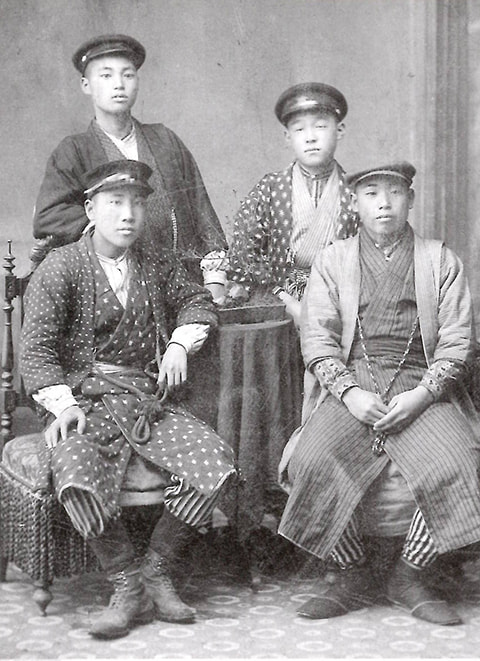 Students wearing Japanese long half-coats (around 1897, from "An illustrated guide of Shitamachi Museum")