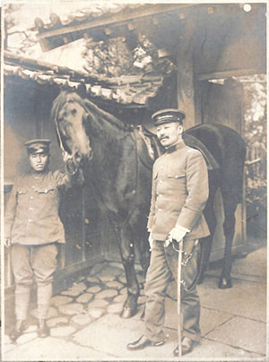 鴎外の足元の敷石は、現在も記念館玄関にあります。(明治45年(1912)撮影、文京区立森鴎外記念館蔵)