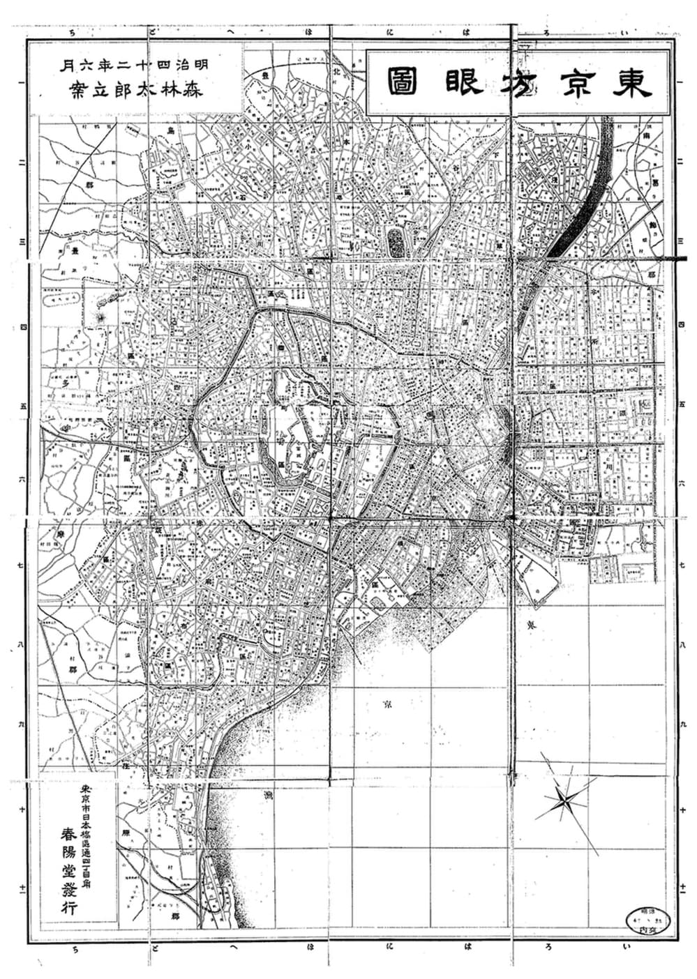 鴎外は古地図を好んで蒐集していたが、自らも東京の地図を立案している。升目を用いた方眼による地図は、当時では珍しいものだった。小説『青年』の主人公の小泉はこの地図を片手に東京を巡った。