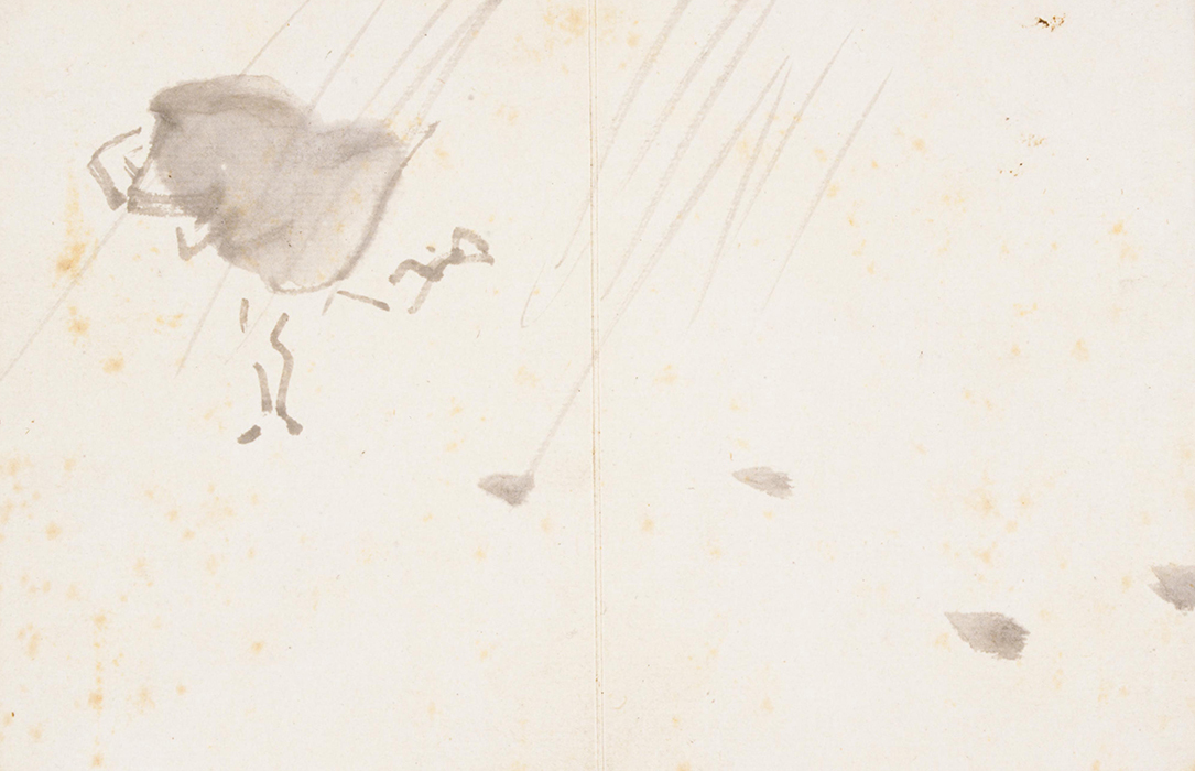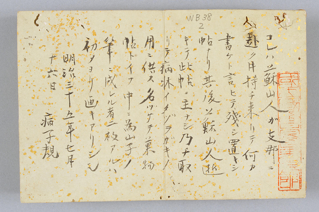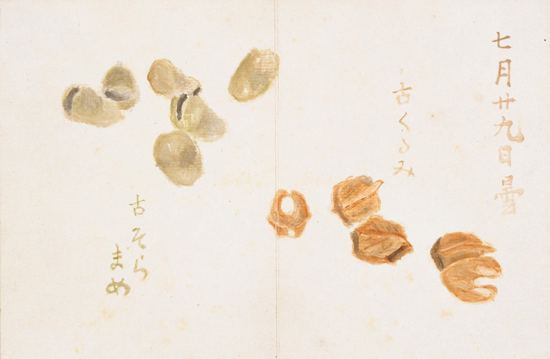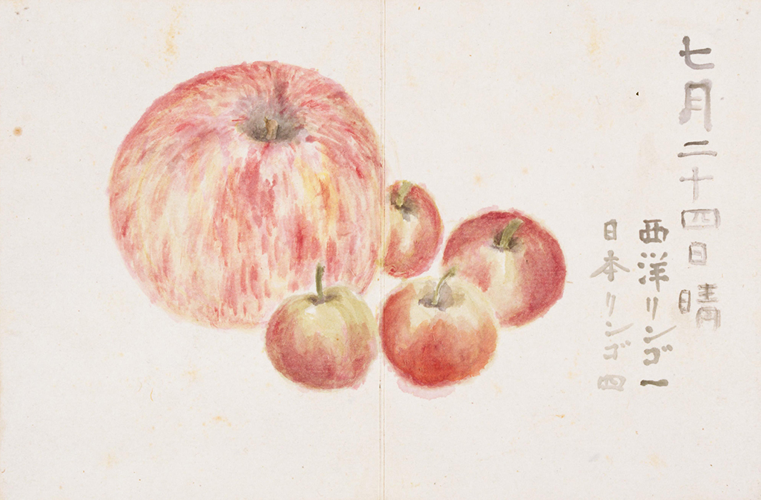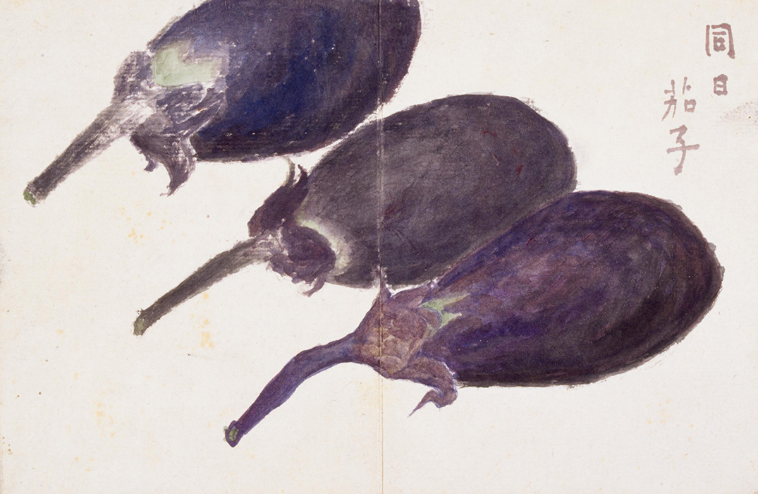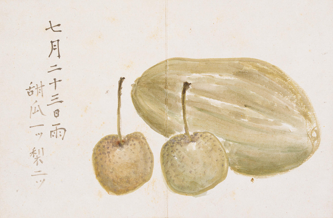 子規在他去世那年明治35年(1902)的6月27日至8月6日之間,畫了18張蔬菜和水果的水彩畫,題名爲《果物帖》。委托子規揮毫作畫(長12cm、橫9cm,盒裝)的是子規的俳句弟子蘇山人,由于蘇山人在清國去世,子規就將這些水彩畫留爲了己用,其中還包括畫家朋友下村爲山的兩幅俳畫。這個時期,子規的骨瘍病情加重,每天都要服用嗎啡止疼,在妹妹的護理下,子規仰躺著在藥力上來不疼的時候畫的這些畫,姿勢很不方便。