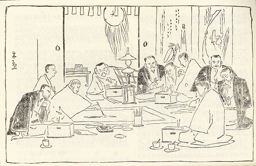 在浅井忠的送别会上三位画家联手合作的讽刺画(子规庵寄存资料)