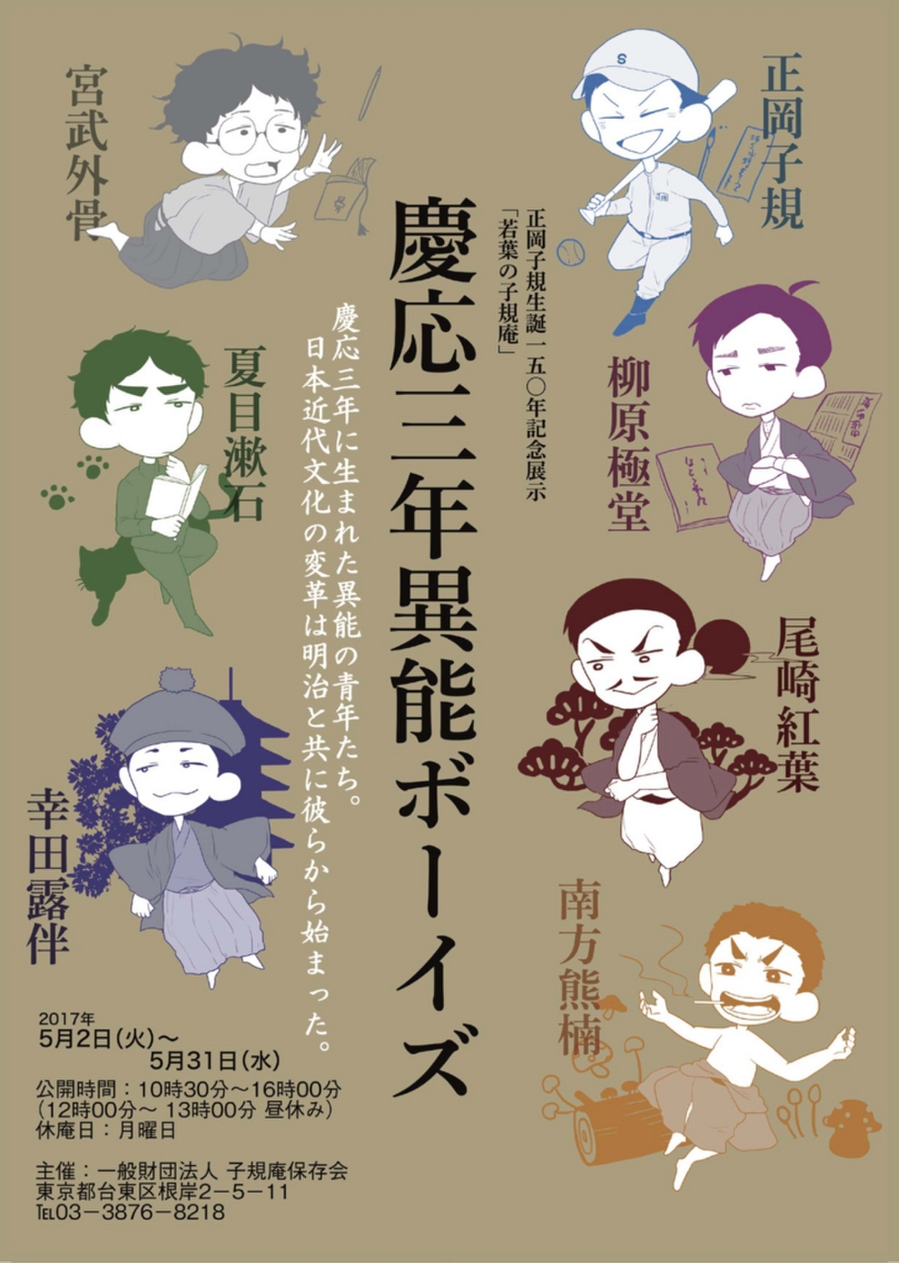 毎年5月に「若葉の子規庵」というパネル展示があります。今年は記念行事の皮切りに「慶応三年異能ボーイズ」と題し、大政奉還の年に生まれた多くの異能の人から、子規、夏目漱石、柳原極堂、南方熊楠、尾崎紅葉、幸田露伴、宮武外骨を取り上げて紹介しました。ボランティアの若い世代、宇宙(そら)の会の会員が、7名の紹介パネルに加えて、漫画風のイラストや異能ボーイズの等身大パネルも制作し、いつもとは違う子規庵の雰囲気が好評でした。
