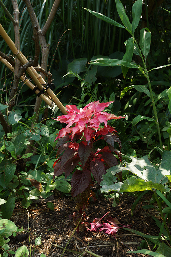 子規庵の庭には、妹の律や友人が病床の子規を慰めるために様々な草木を植えました。「小園の記」には小園の図があり、俳句で草木がその場所場所に示されています。椎、竹、松、萩、芒、鶏頭、桔梗、朝顔、秋海棠、おしろい花、葉鶏頭、百日草です。松葉牡丹は別名の日照草(ひでりそう)と両方登場しています。子規の好きな薔薇や、子規庵の象徴のような糸瓜はこの頃まだ無く、糸瓜棚は34年に作られました。