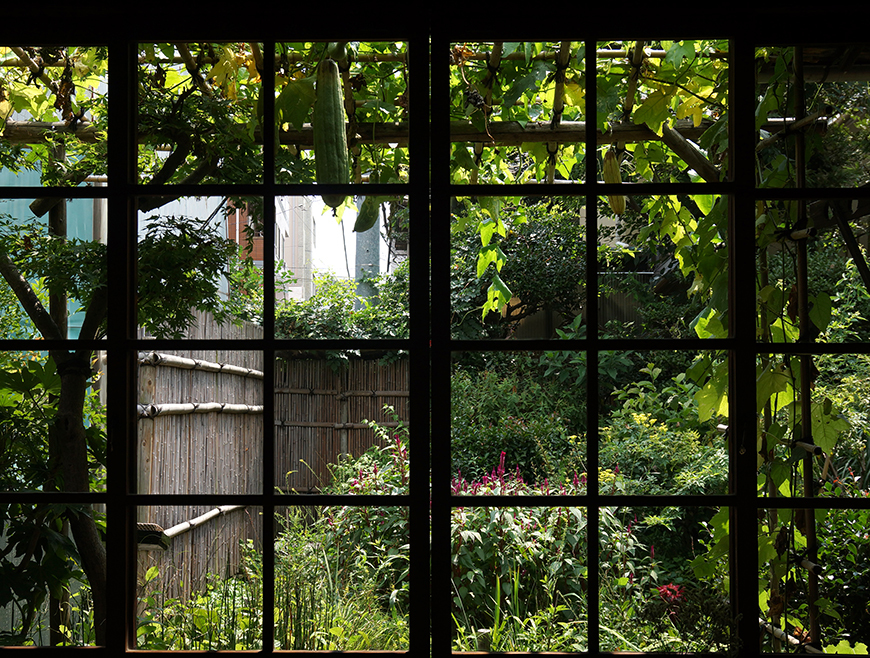 左手の棚は、明治34年6月に植木屋を呼んで作らせた糸瓜棚。現在の糸瓜棚の2倍程の大きさでした。正面の南側の生け垣には木戸があり、左手奥に上野の山が見えます。