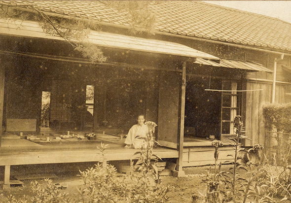 鶏頭の花が咲いた庭を眺めて寛ぐ八重。明治44年(1911)9月、門人の河東碧梧桐撮影(子規庵寄託資料)