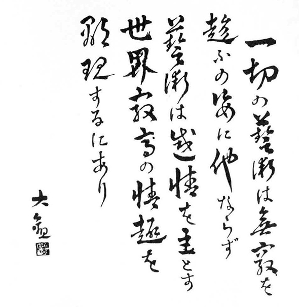 大觀把天心的話“一切藝術都需要我們永遠去追求藝術是以表達情感爲主的世界最高的情趣”作爲自己的座右銘,爲後世留下了很多名作。(出自橫山大觀紀念館的“大觀語錄”)