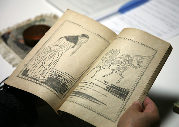 Since he taught at the design department for the first time, he studied design, and created cover art and illustrations for books. I think this brought positive effects to composition of his paintings. Other professors, including Shunso Hishida, also created illustrations. This is a book on Rekko Mito published by Hakubunkan. Yokoyama was born in Mito, and his father and grandfather were clansmen of the Mito clan and engaged in drawing maps.