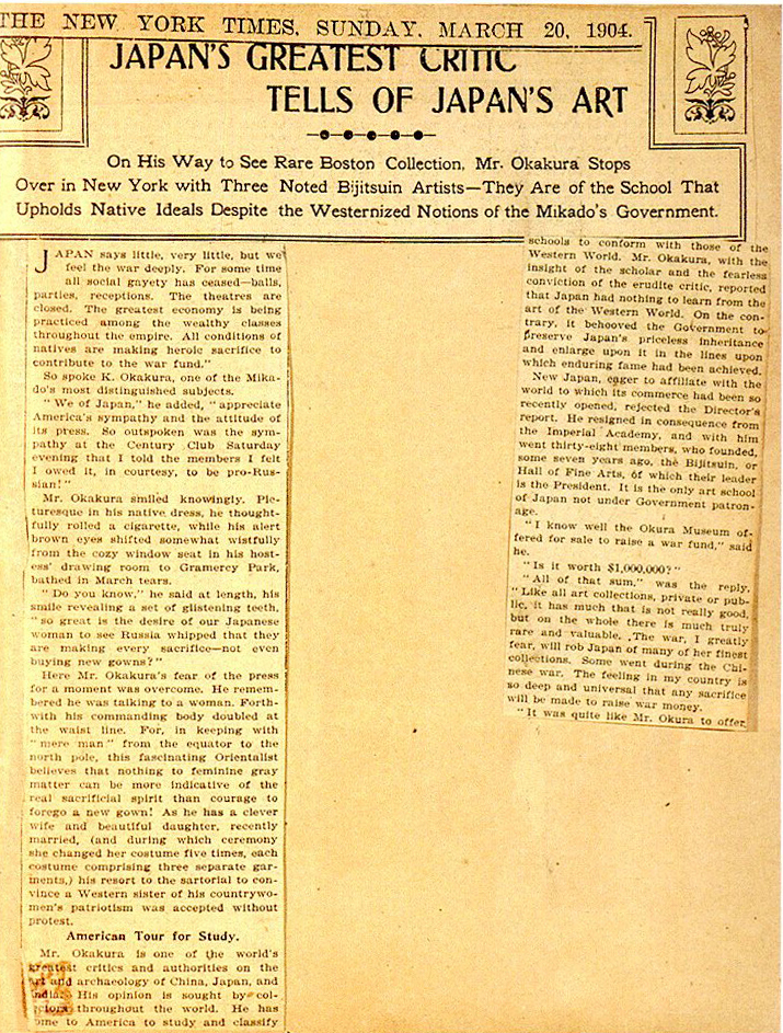 从哈佛大学寄来的天心出席文学修士“Masters of Arts”学位授予式时的新闻报道,新闻报道的左右空白上的字是天心的弟由三郎写的。