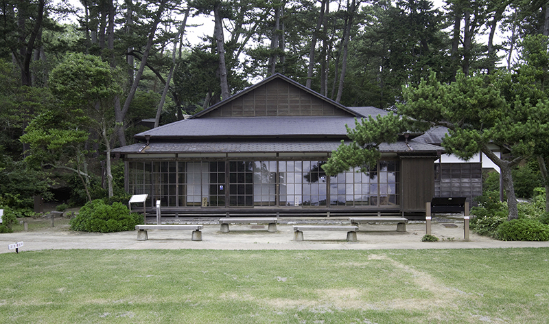 天心の旧宅は、明治37年(1904)に天心自らの設計で平潟の棟梁の小倉源蔵により建てられました。天心が五浦に移り住む以前は、この地には鮑(あわび)の割烹料理店観浦楼があり、この建物の木材の一部を利用したとも言われています。当初の建物は、62坪(おおよそ205平方メートル)でしたが、明治38年(1905)に拡張されました。現在は、本邸の西側の天心の書斎や東側の浴室は撤去されています。