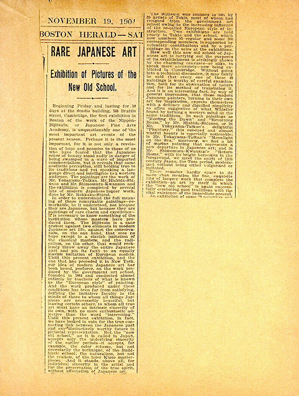 텐신과 함께 미국으로 건너간 다이칸, 슌소는 미국 각지와 유럽을 돌며 전시회를 개최했습니다. 이러한 활동을 전하는 신문기사를 수집한 신문기사 절취첩은 표지를 포함해 52페이지로 구성되어 있습니다. 텐신의 미국 체류기간 동안 출판한 「The Awakening of Japan」나 신문 논설 「Japan and the 'Yellow Peril'」등의 귀중한 자료가 포함되어 있습니다.