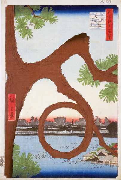 廣重在其所畫的《上野清水堂不忍之池》中,描繪了以豔麗藍色的池之端爲背景的清水堂的舞台和不忍池畔亭亭玉立的月之松。複原再造的月之松,種植在清水堂的舞台下,從舞台的正面能夠看到這棵松樹。雖然現在上野山的周邊已經變得樓台林立,但是從清水堂放眼望去,映入眼簾的仍然是一派充滿江戶時代風情的景象