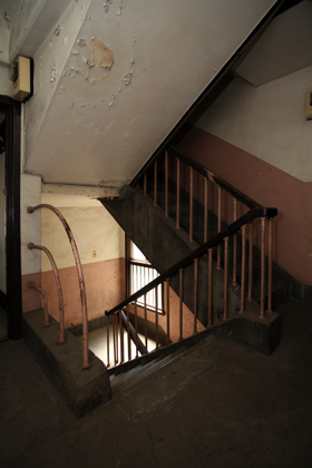 一号館は、1階に商店店舗スペースがあり、2階から4階は世帯用住宅となっています。二号館は、1階から3階が世帯用住戸、4階は単身者用住戸と共用の水場、トイレとなっています。関東大震災後の震災に備えた堅固なコンクリート造で、室内にも大きなコンクリートの梁がある簡素な構成となっていますが、ドアやドア・ノブ、電灯スイッチや欄間、そして一階の集会所となっている部屋の受付の窓を飾る格子等に大正、昭和初期のモダニズムが感じられます。